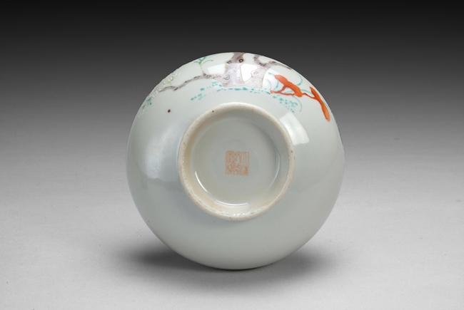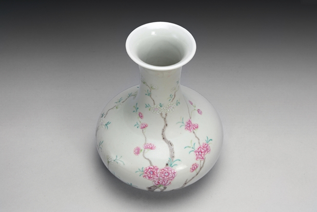 The vase features different flowers on tree branches; pear shaped body; mark of "QIANLONG".