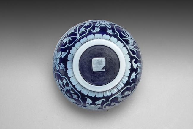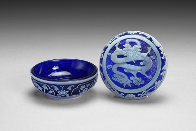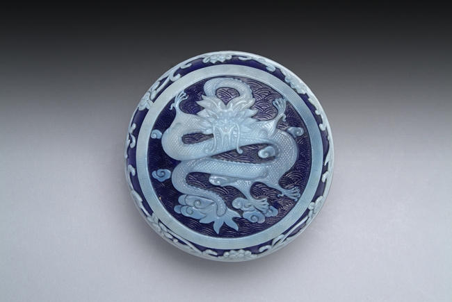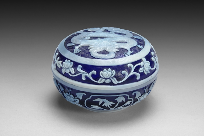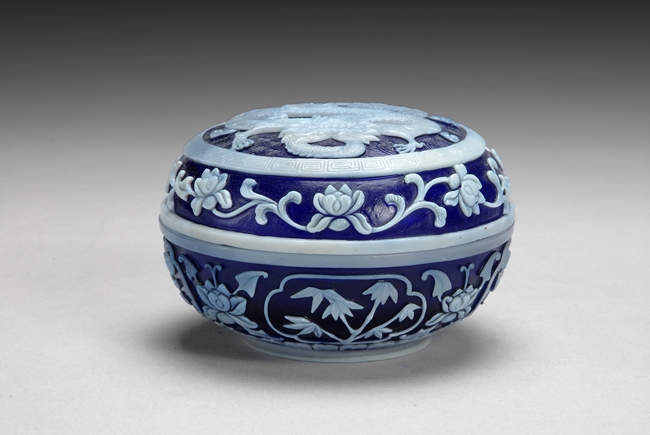 The jar uses two different colored glass; on the lid features a flying dragon; lotus and vine patterns surrounding the dragon; four character mark on the bottom.
