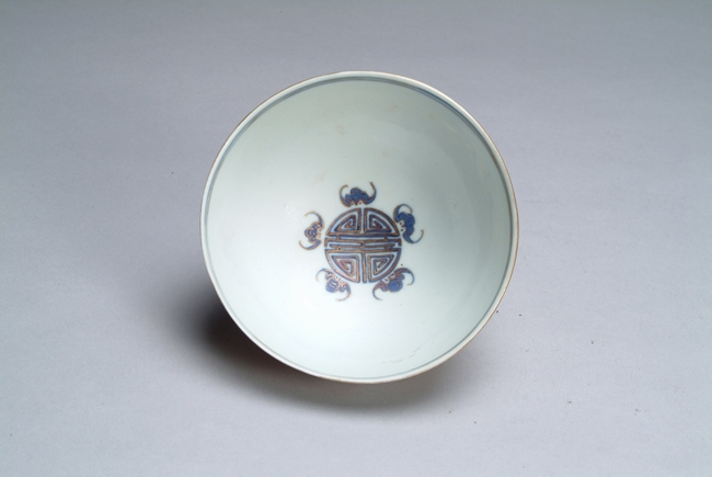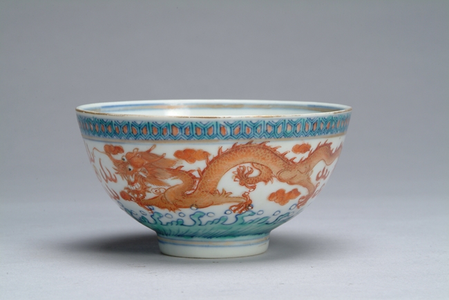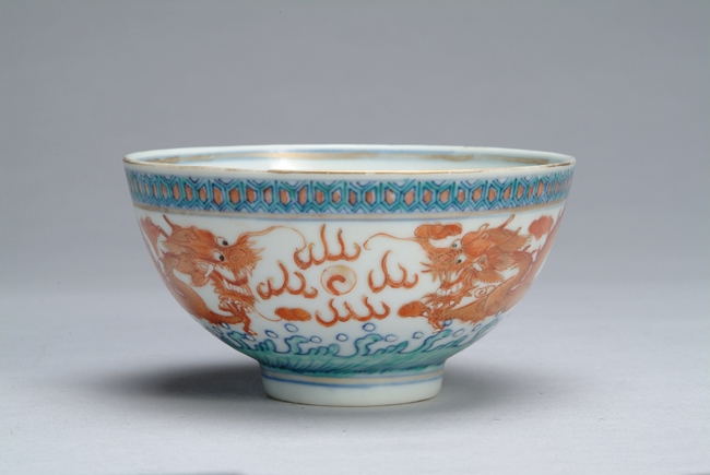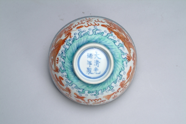 The bowl's exterior depicts two red colored dragons playing with a ball, while flying over ocean; inside has bat patterns; mark of "GUANGXU".