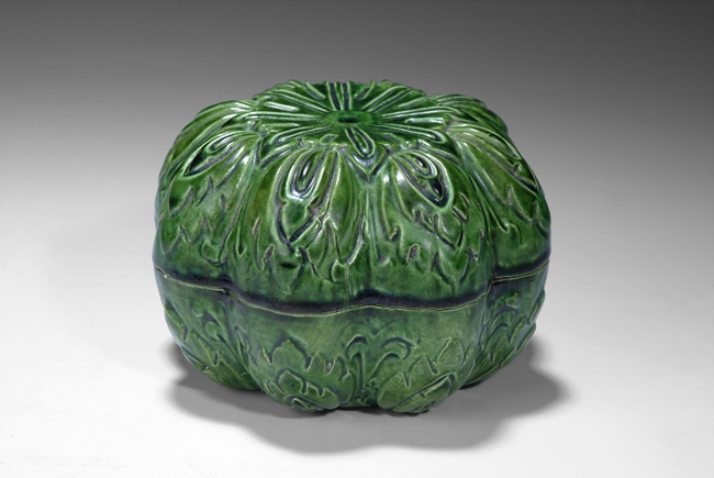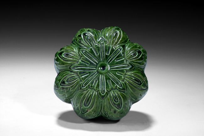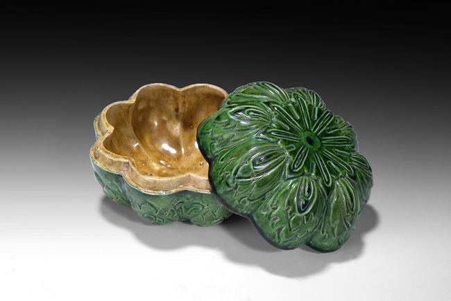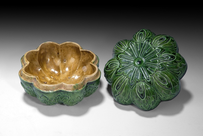 A cover box with green glaze on the exterior, and brown glaze on the interior. The box is shaped similar to lotus flower petals, with lotus designs on the exterior. The box was fired on spurs. Qing Dynasty period.
