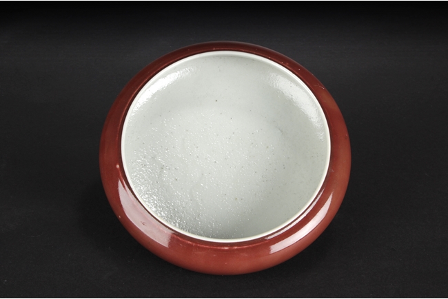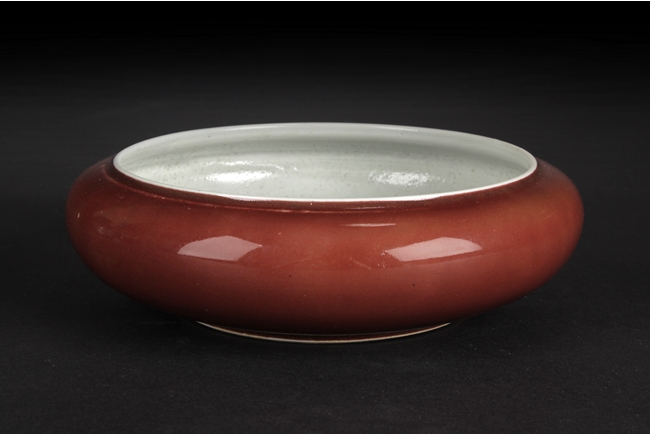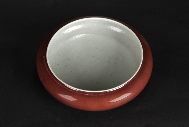 Of flattened ovoid shape, the brush washer covered overall evenly in red glaze, base unglazed.