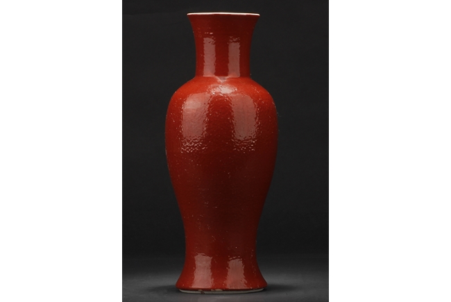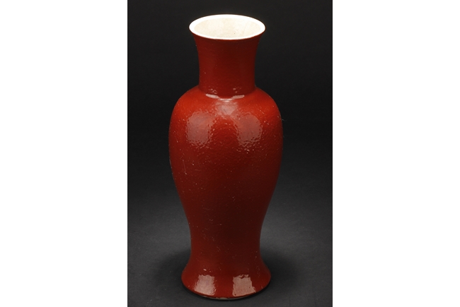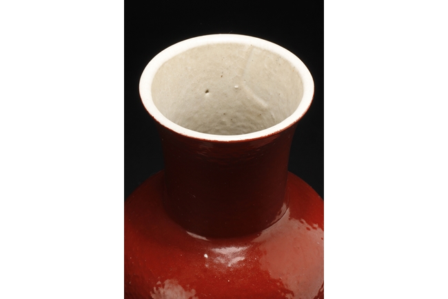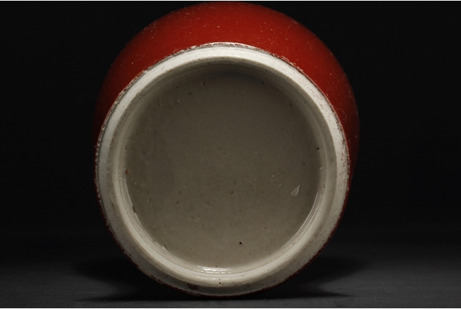 The slender shouldered body resting on a splayed foot, the exterior covered overall with red glaze over bumpy orange peel-like surface, foot unglazed.