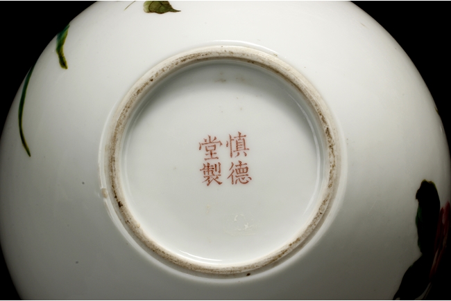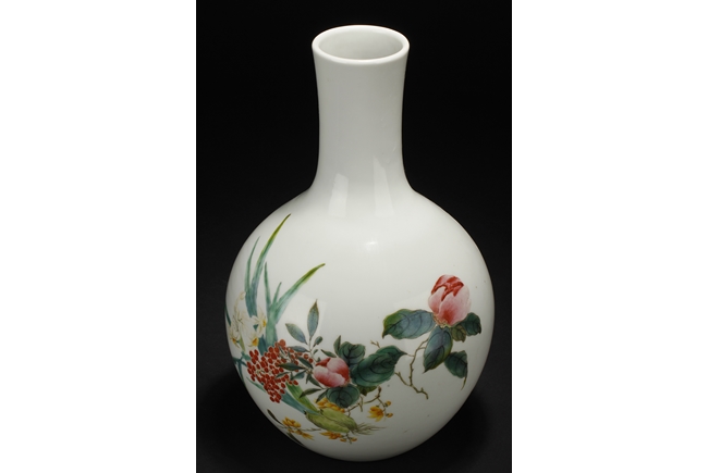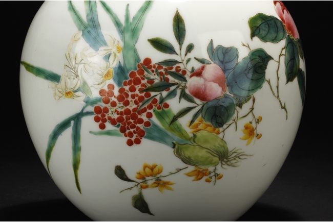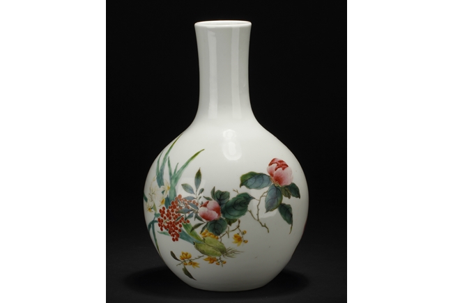Of ovoid shape with a cylindrical neck, decorated with colorful blooming flowers, bottom bears four characters mark.