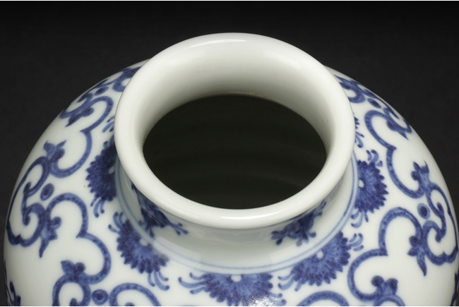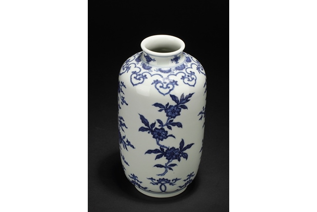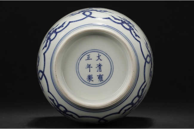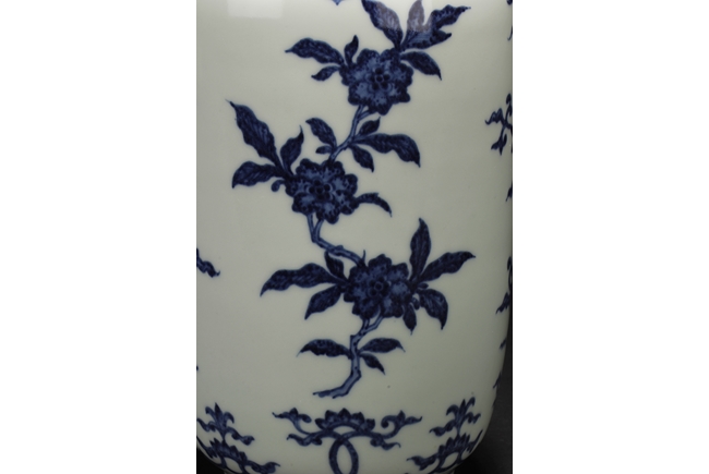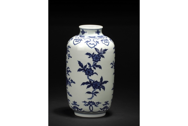 Of cylindrical form tapering slightly towards the unglazed foot and rising to a short, waisted neck with everted rim, well painted with flowers on vines, below Ruyi patterns, all supported on a slightly tapered foot. Bottom bears six characters "YONGZHENG" mark.