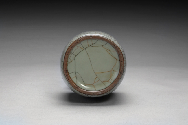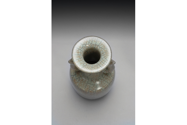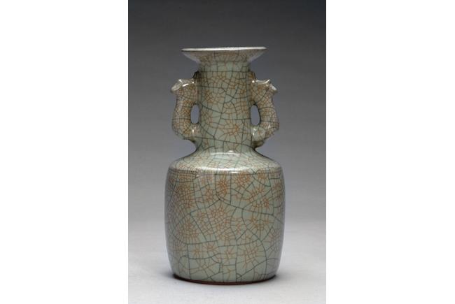 The vase of cylindrical shape with waisted neck, two ear handles attached, body covered with crackleware design in black and red lines, all over celadon colored body.