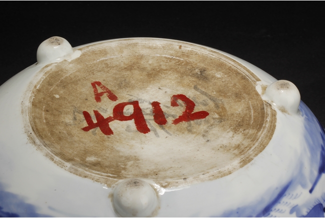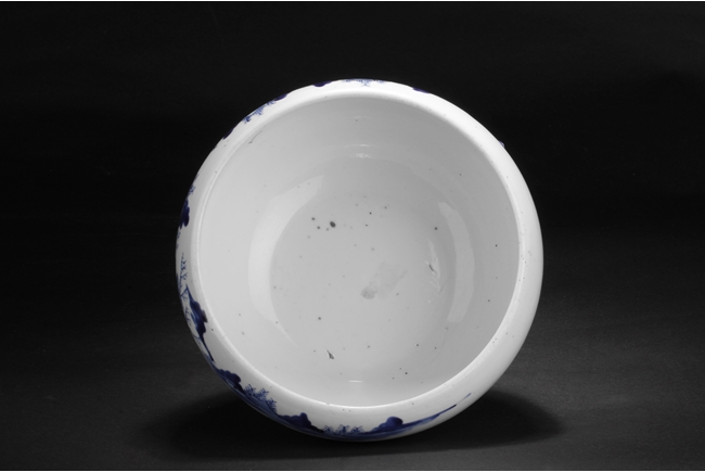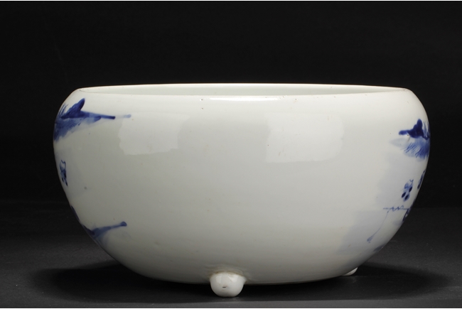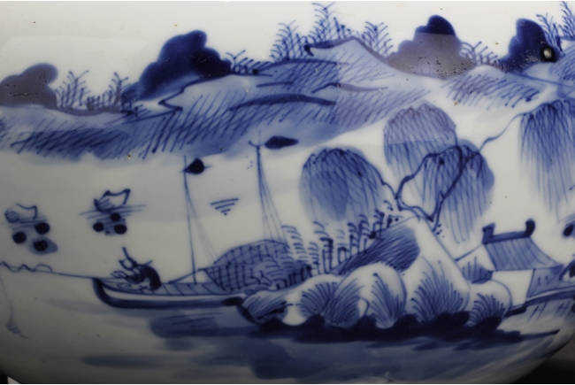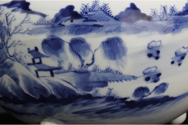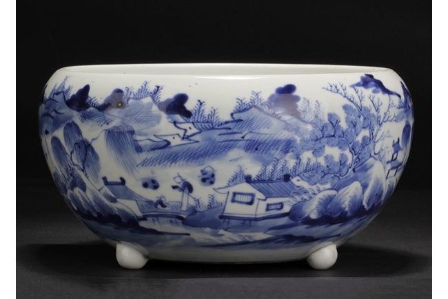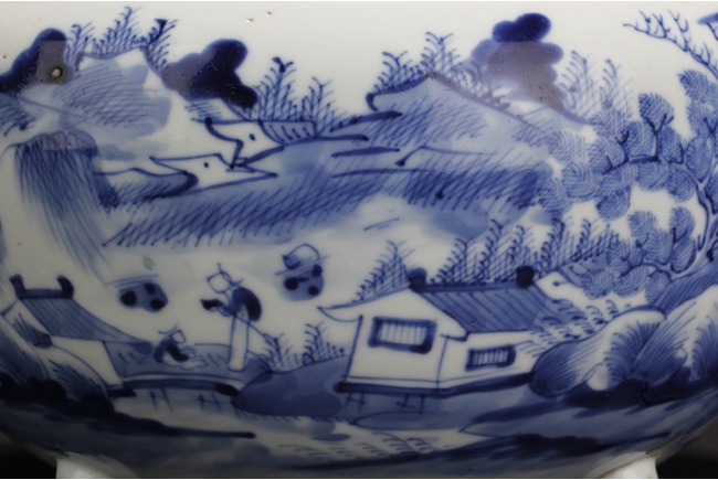 Of globular form, the unusual jar has three short stud legs, supporting the bowl. The exterior painted with a landscape scene, with mountains, villages, trees, boats, and people.