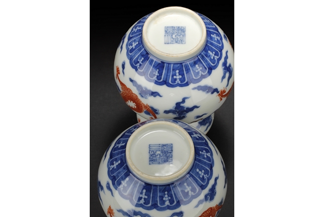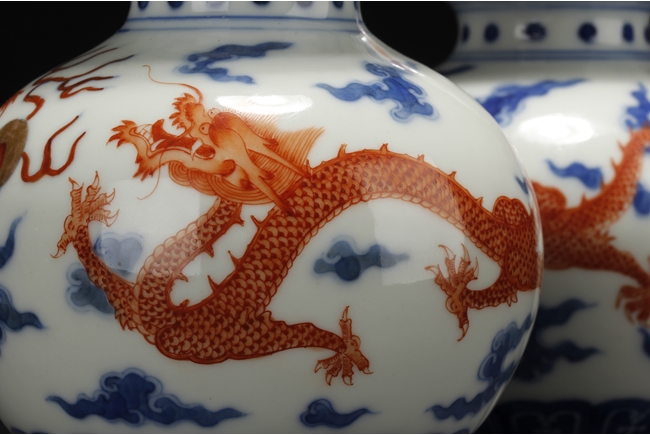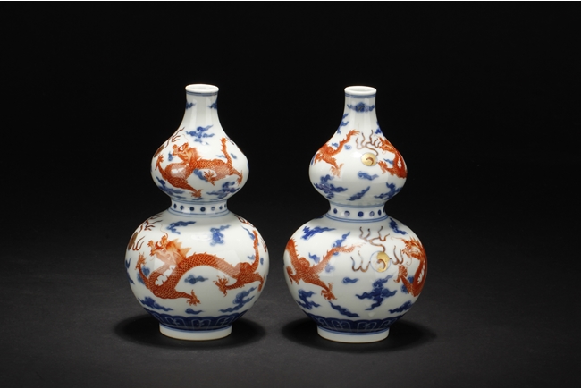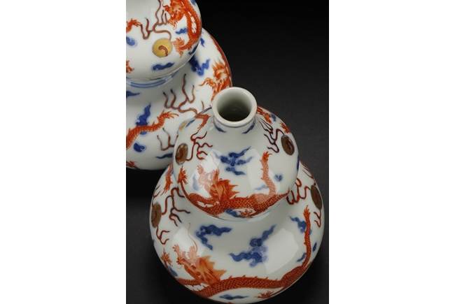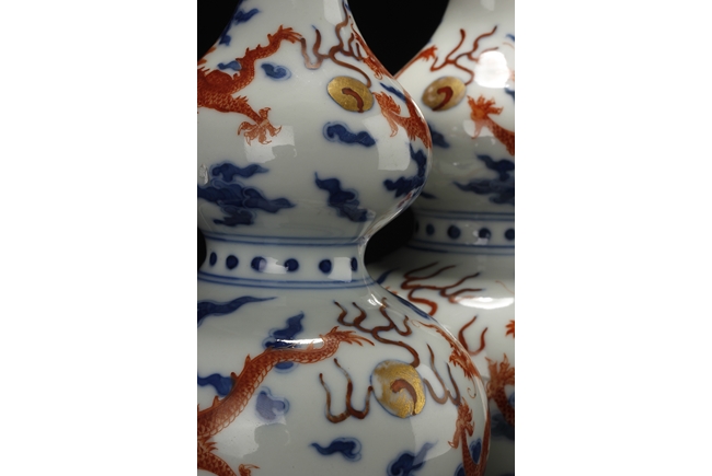 Of double gourd shape, the vase was painted in copper-red with four dragons striding through a continuous clouds, chasing after two precious pearls.