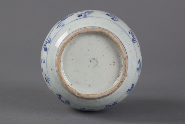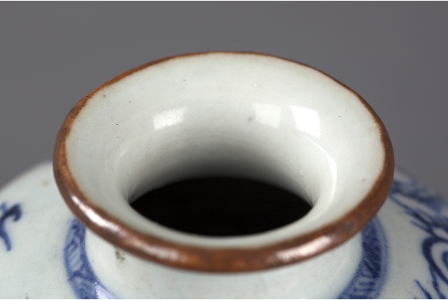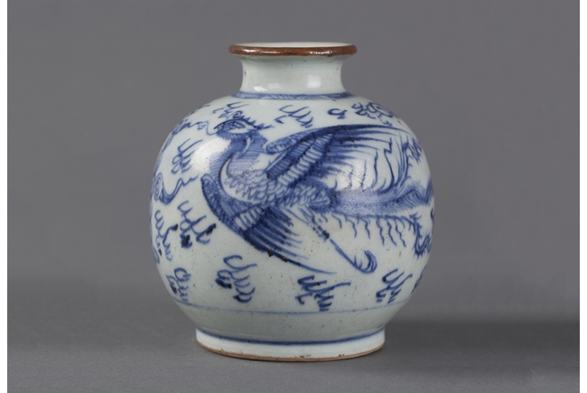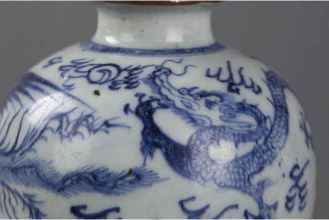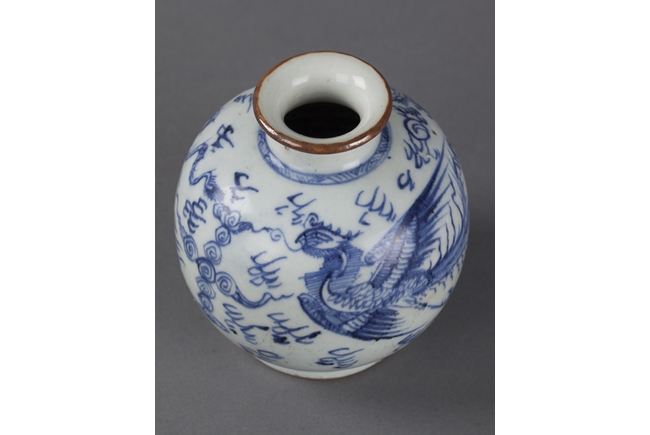 Of globular form, the exterior with flying phoenix and dragon amidst clouds, base unglazed.