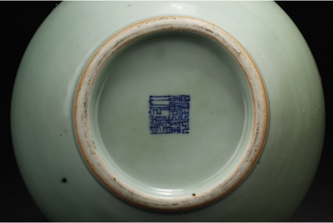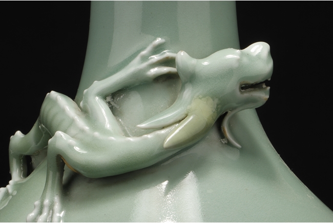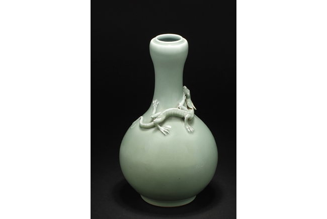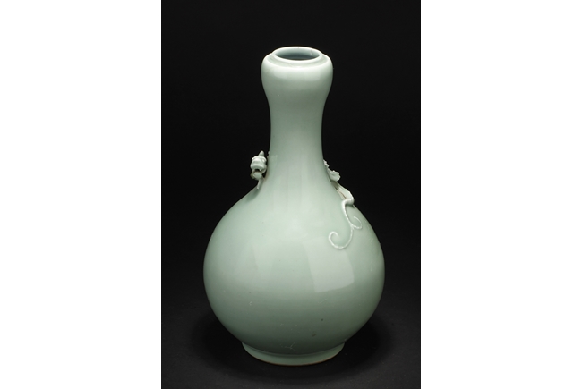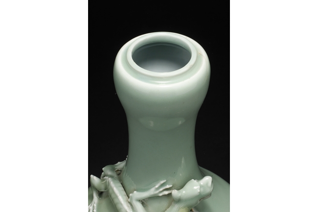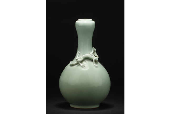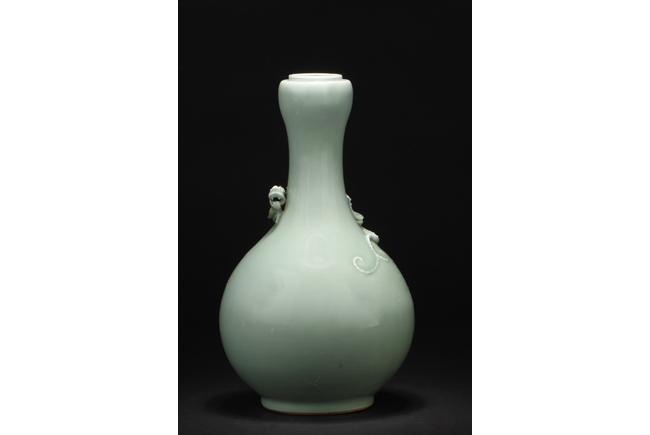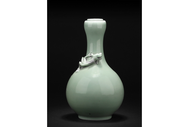Of globular form, the vase stands on a round foot ring, with long neck leading to garlic head shaped top, surmounted by a Chilong climbing on the side. Bottom bears six character "QIANLONG" mark.