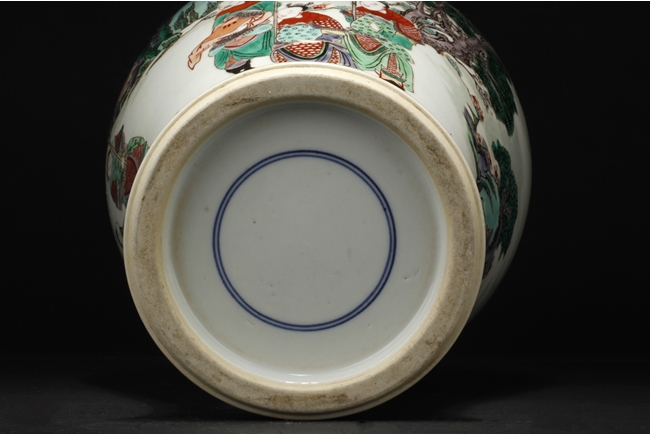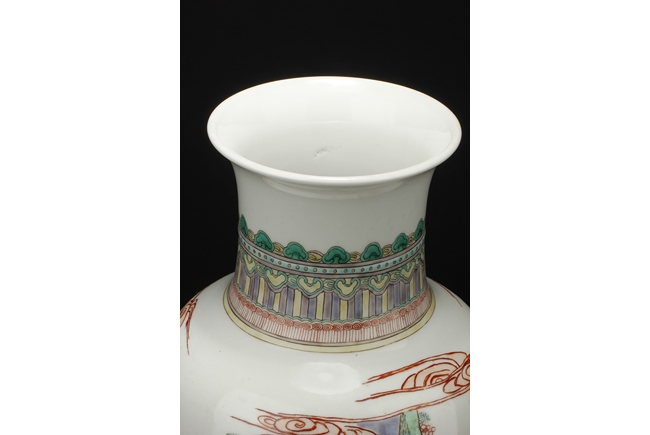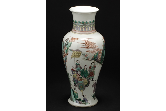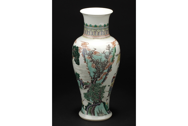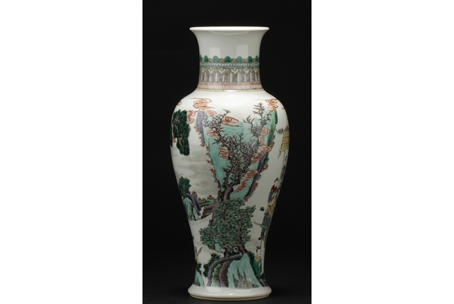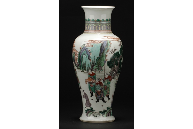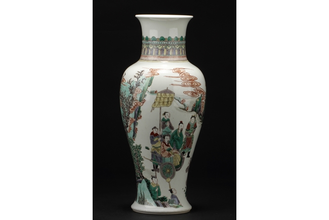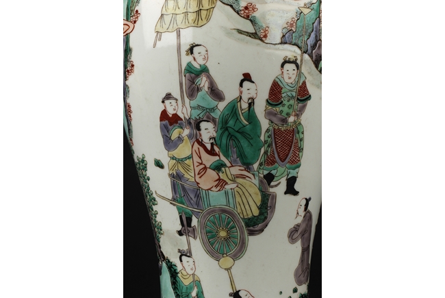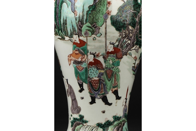 Of tapering cylindrical form with splayed foot, waisted neck, and flaring lip, the exterior depicts a seated general, surrounded by servants, meeting with soldiers and commoners in a mountainous setting, surrounded by pine trees, mountains, rocks, and clouds, all below scrolling Ruyi patterns.