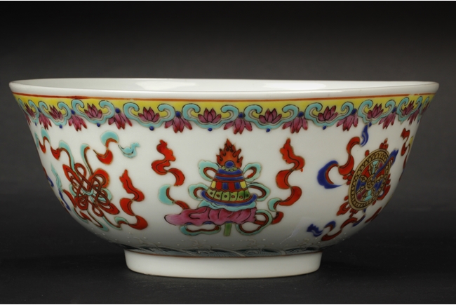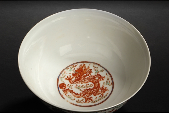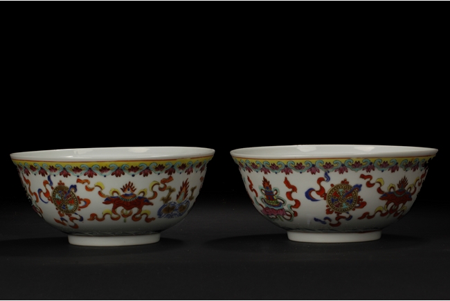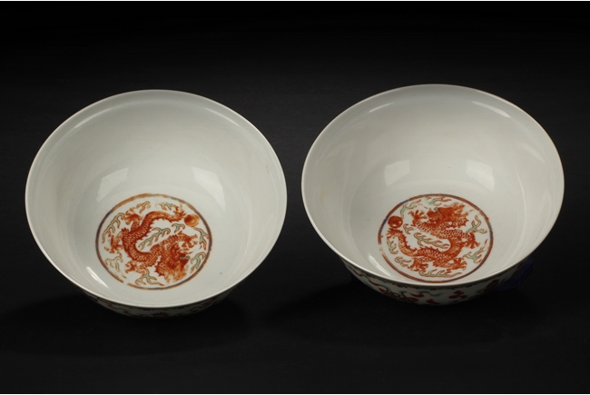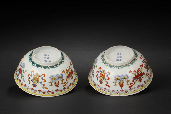 The cups decorated with colorful depictions of Eight Treasures on the exterior, between flowers, Ruyi, and wave patterns, interior decorated with a flying five claw dragon. Bottom with six characters "GUANGXU" mark.