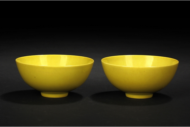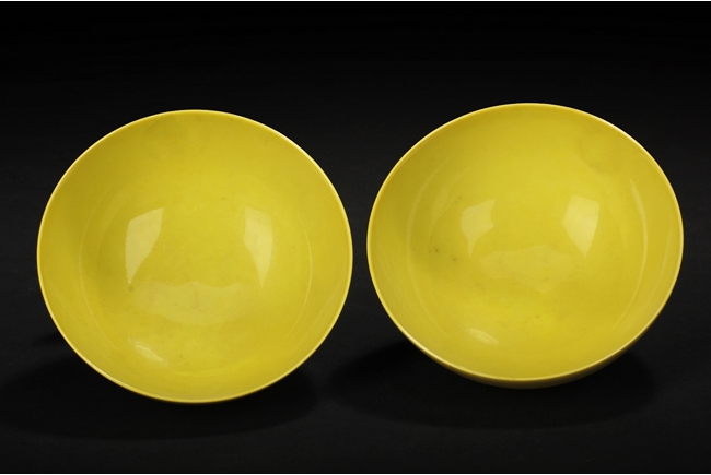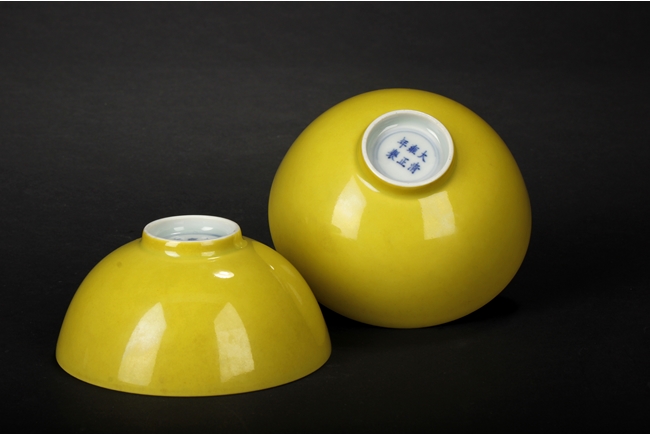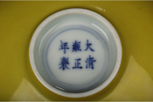 Raised on a slightly tapered foot ring, with smooth rounded sides, covered all over in a glaze of lemon-yellow tone, the convex base glazed white. Bottom bears six characters "YONGZHENG" mark.