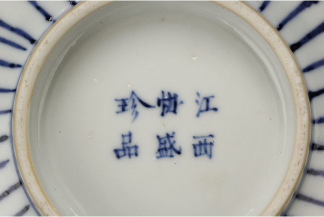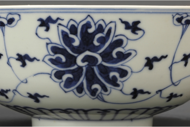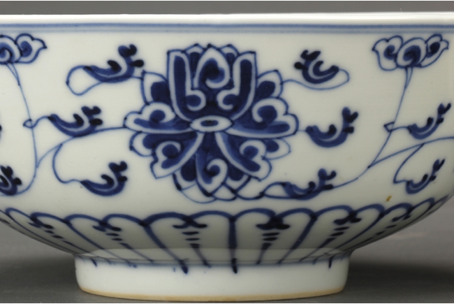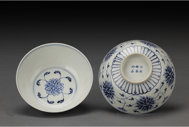 The exterior covered with scrolling flowers pattern, the interior with a single blooming flower, and the bottom with six Chinese character mark.
