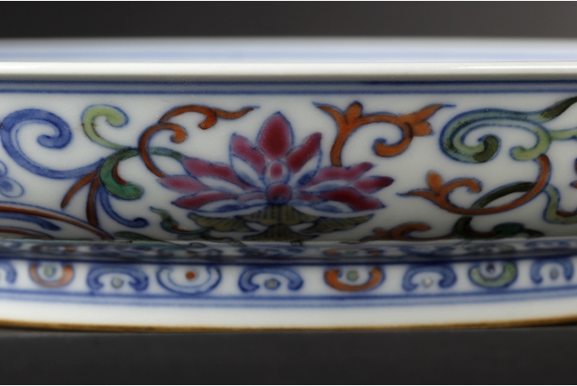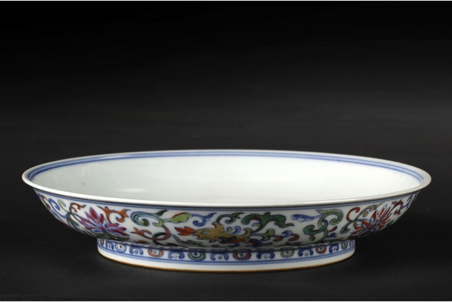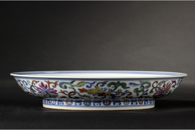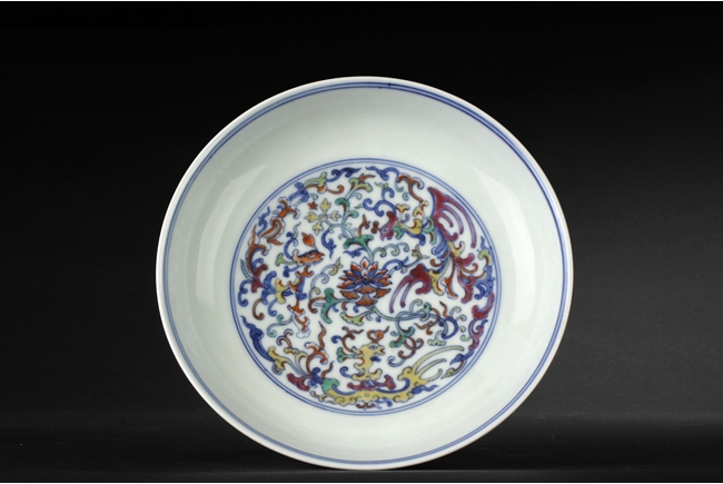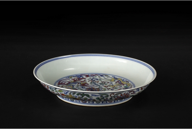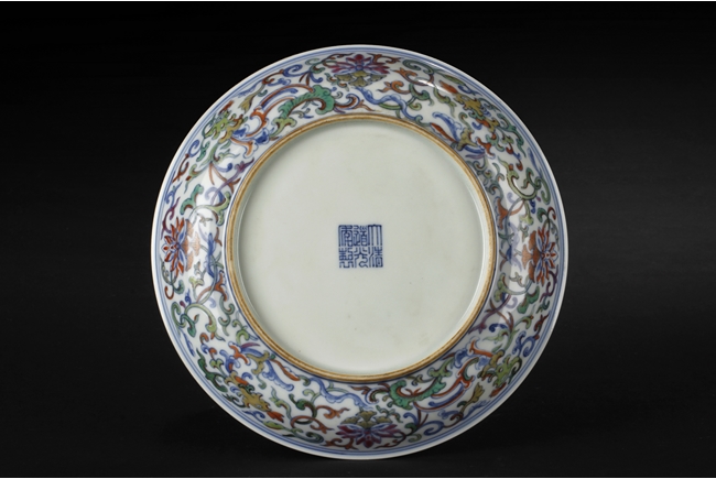 The shallow plate decorated with scrolling flowers and vines on the interior, with three phoenix forming out from flowers surrounding the center flower, repeated on the underside. Bottom bears six character "DAOGUANG" mark.