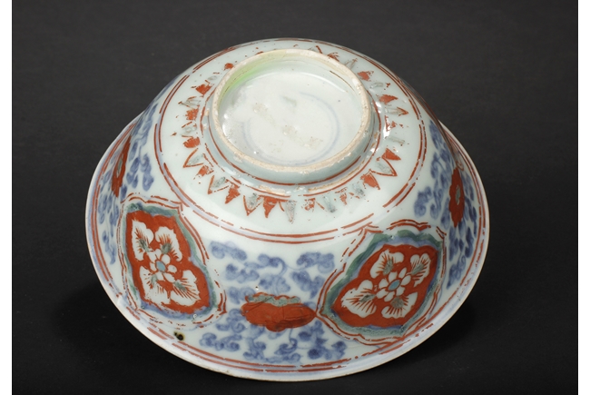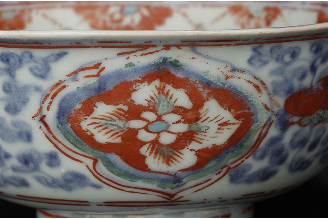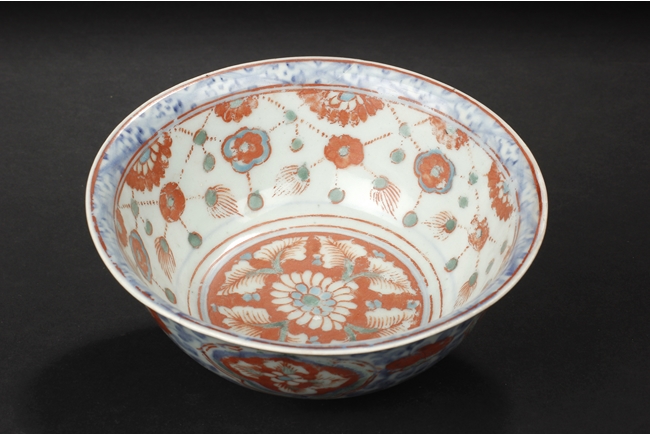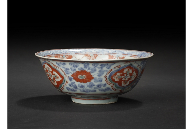 The bowl with flaring lip, the exterior decorated with copper red colored flowers, in between underglazed blue vine patterns, the interior with similar decorations and patterns.
