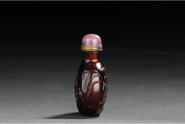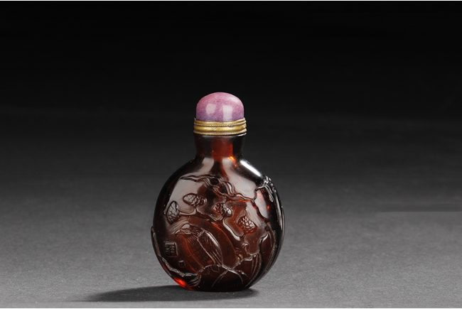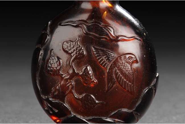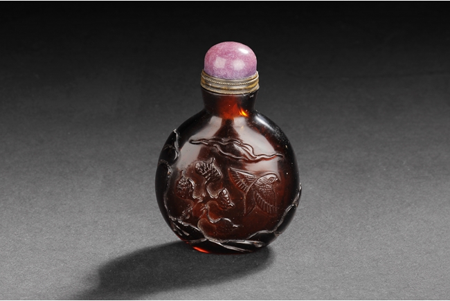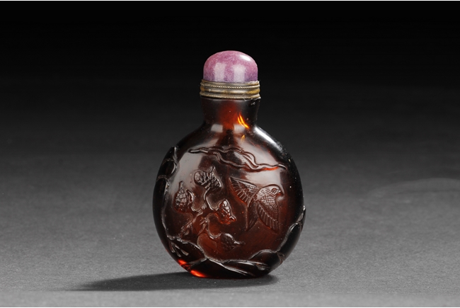 The well-hollowed snuff bottle is of flattened, rounded form, dark tea color with slight transparency, finely carved on one side with a lone bird taking flight from a branch, and on the reverse with another bird resting on a pine tree, with artist mark. Qing Dynasty period.