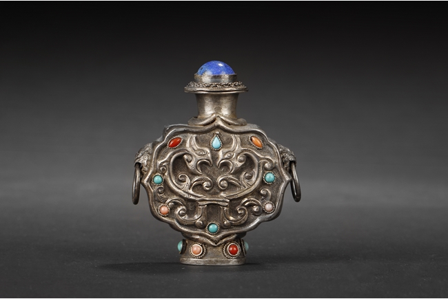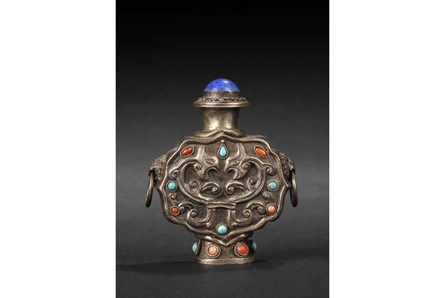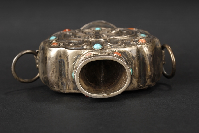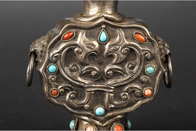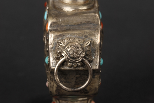 Sculpted with mythical beast on the front and back, two beast mask ring handles on the side, embellished with coral, turquoise, and lapis lazuli.