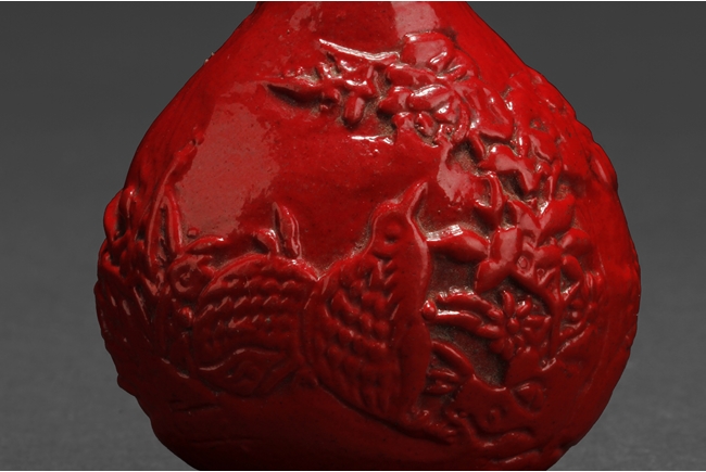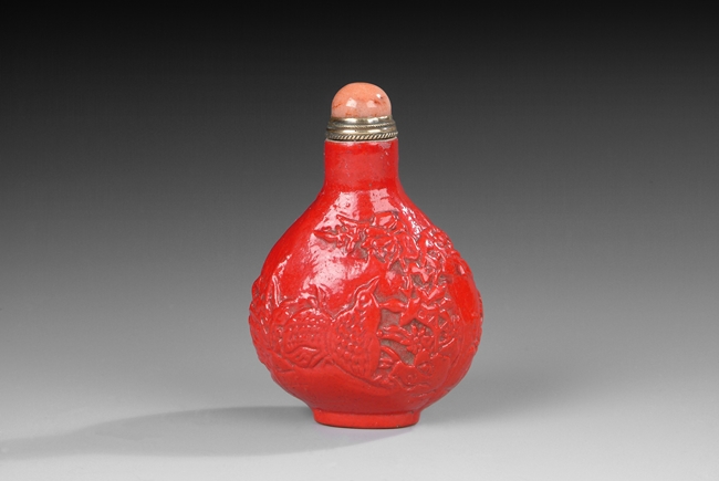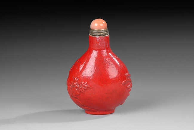 Of ovoid form, the red glazed snuff bottle is finely carved, depicting elegant scenes of two birds surrounded by flower patches, gracefully extending its branches towards the back of the bottle. Hardstone stopper on top. Republic period.