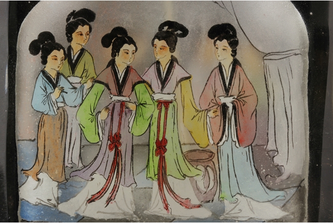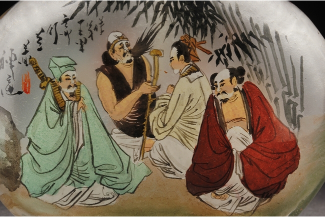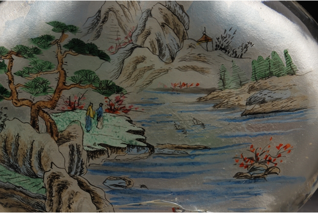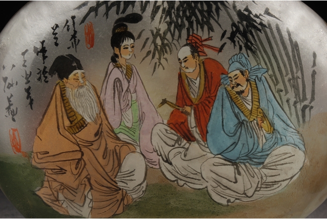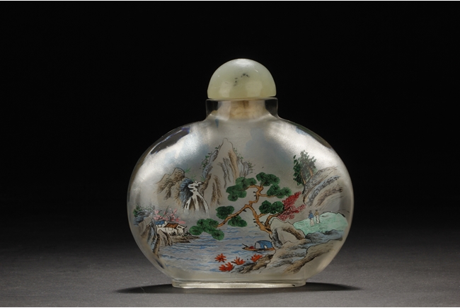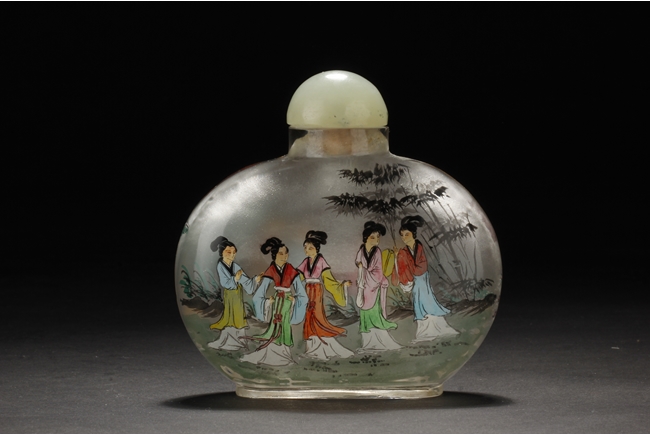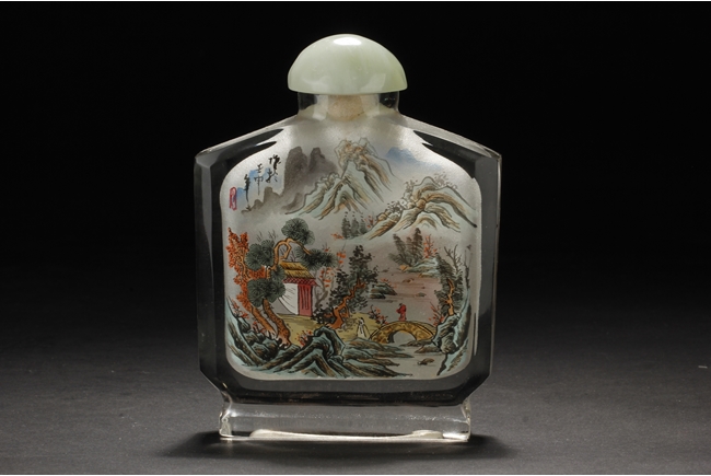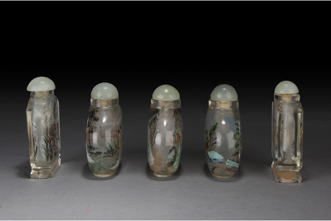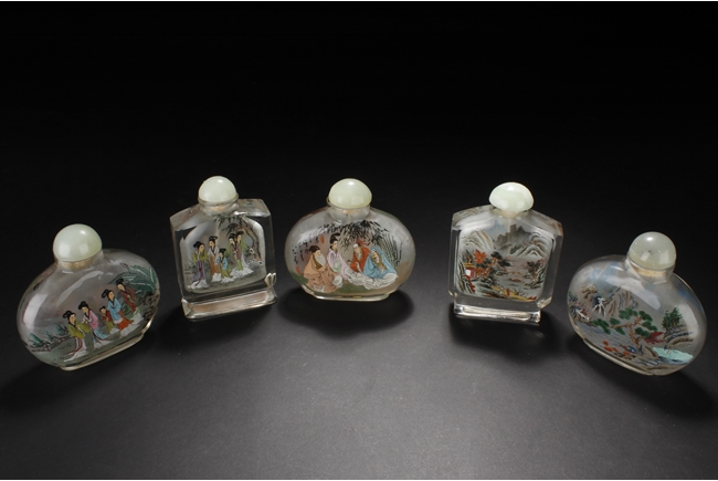 The snuff bottles come in rectangular or flattened ovoid form, all inside painted on both sides, depicting ladies, elders, landscape, and villages. Some snuff bottles with artist signature and marks.