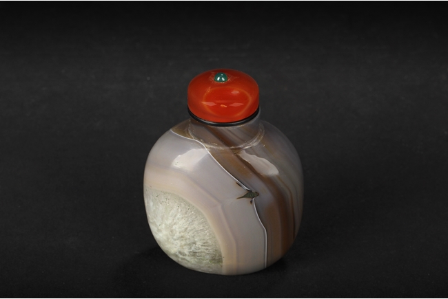 Of round shape, the snuff bottle was cleverly made with natural stone layers, showing multiple colors on the body, and capped off with a glass stopper.