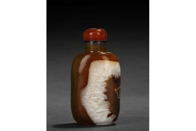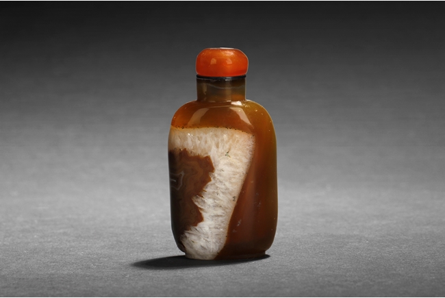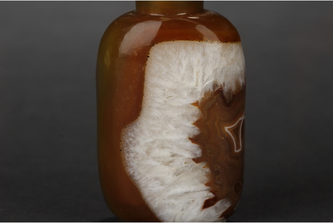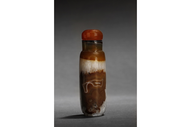 Of flattened cylindrical shape, the snuff bottle made of stone with natural layers shown as beautiful two tone, and capped off with glass stopper.