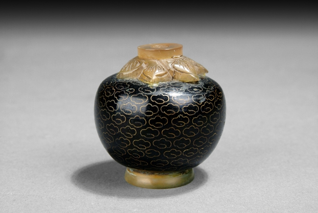 Of globular form with recessed oval foot, a single flower branch with light pink and yellow flower petals on one side, all reserved on a black background with a continuous pattern of clouds. Delicately decorated with flower petal shaped patterns on the top. Missing stopper. Qing Dynasty period.