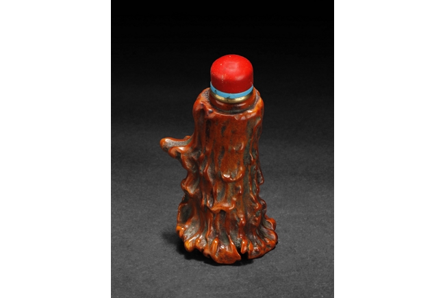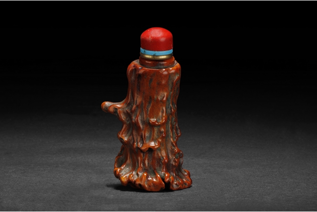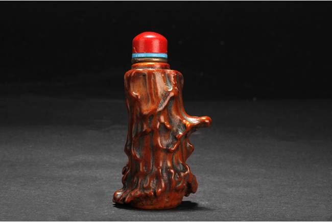 Of naturalistic tree trunk shape, the snuff bottle carved in layers, with mostly orange-red color.