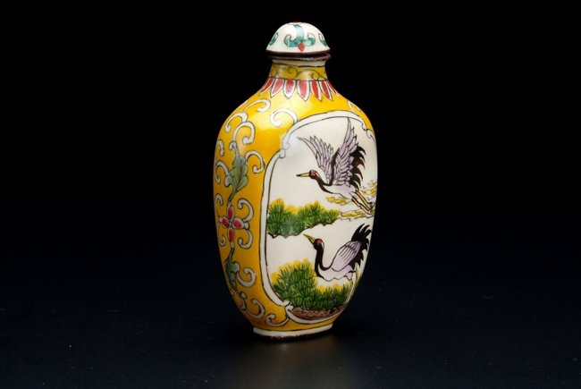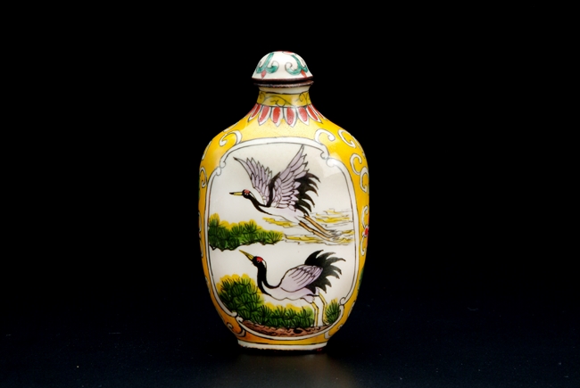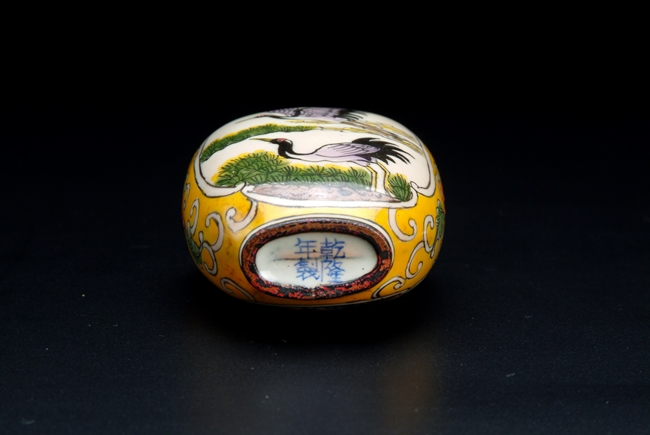 The snuff bottle depicts flying cranes near a lake; mark of "QIANLONG".