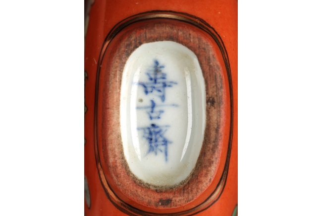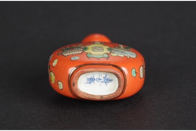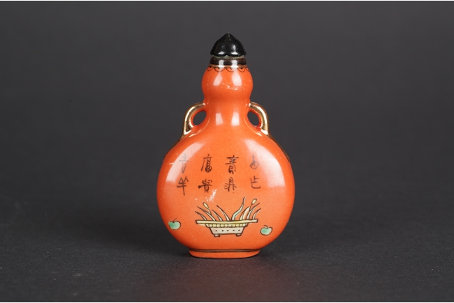 Of flattened gourd shape, the snuff bottle covered overall in orange-red glaze, front side depicts flowers and planters, back side depicts eight Chinese characters above a planter, bottom bears three characters mark.