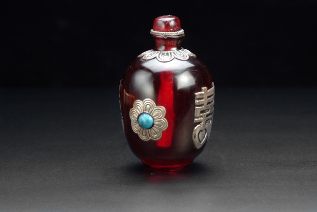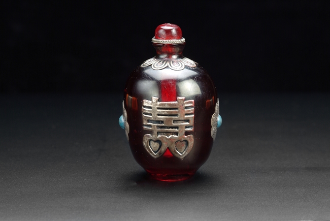 The front of snuff bottle has Chinese character Double Happiness, the side two two turquoise.