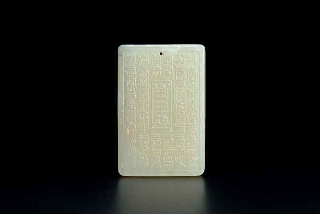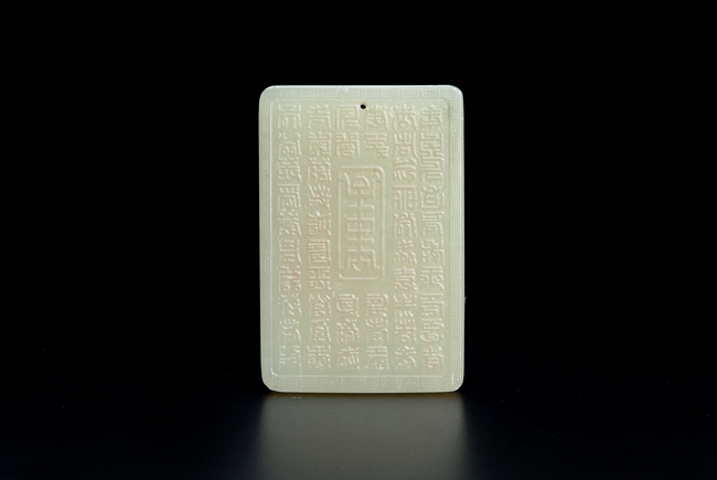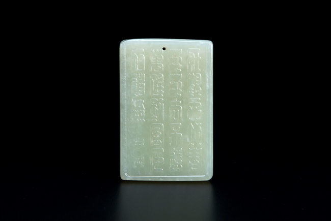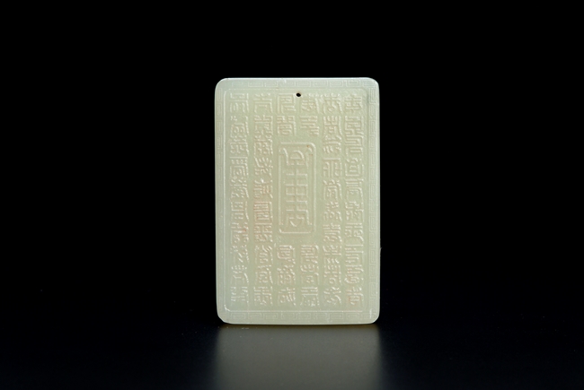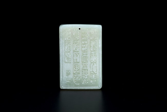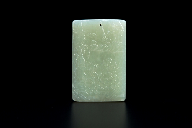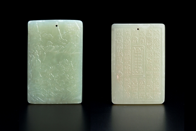 One pendants depicts a landscape scene with two people in the foreground, the other side with a poem. The other pendant depicts one hundred different ways to write the Chinese character "Shou".