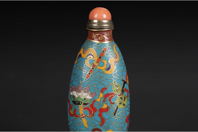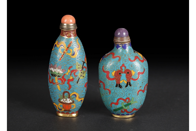 One snuff bottle of long oval shape with coral stopper, the other snuff bottle of flattened oval shape, with a purple stone stopper. Both snuff bottles depict the Eight Treasures on its body, amidst cloud or circular patterns.