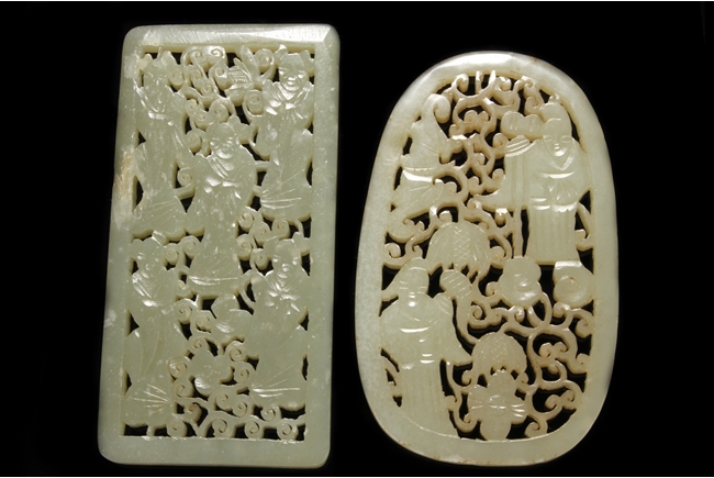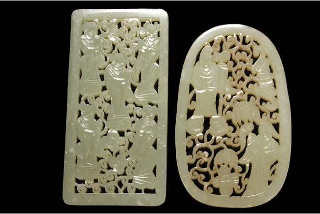 One pendant of rectangular shape, pierce carved with five female figures surrounded by vines and flowers. The other pendant of oval shape, depicting two people within vine patterns along with flying bats.