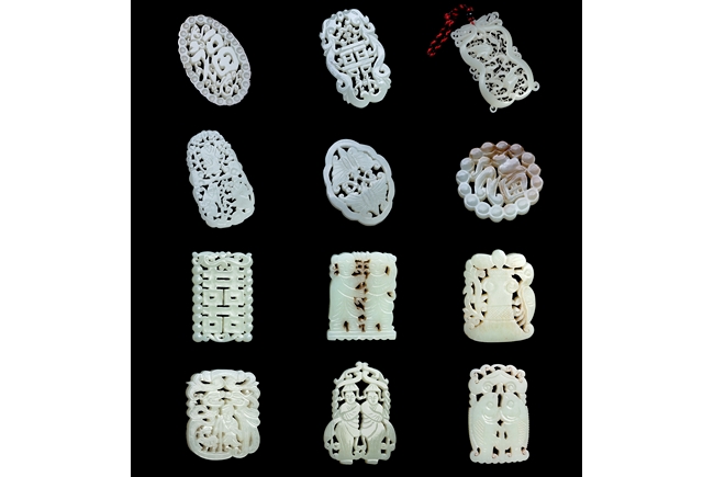 This lot includes 12 jade ornaments and pendants, with different themes, carvings, and sizes.