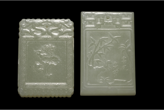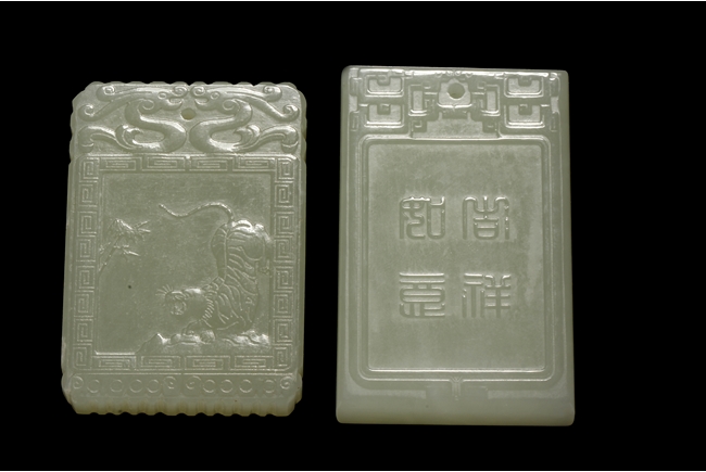 One pendant carved with a pouncing tiger on the stone ledge near bamboo tree on one side, a carp leaping next to a lotus flower on the other side, all within scrolling key-fret pattern, surmounted by two dragons on top of pendant. The other pendant carved with bamboo trees growing near stones, with the Chinese characters "GAO FENG LIANG JIE", the other side carved with Chinese characters "JI XIANG RU YI".