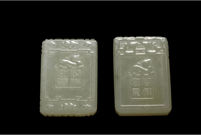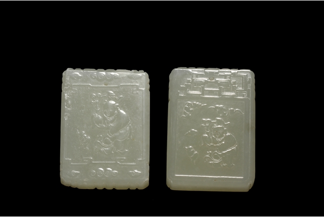 Both pendants of rectangular form, one side carved with a celestial boy holding a vase of plant, surrounded by floating clouds and flying bats, other side carved with a Chilong surmounted on top of Chinese characters "JI XIANG RU YI". One pendant with minor imperfections on the surface.