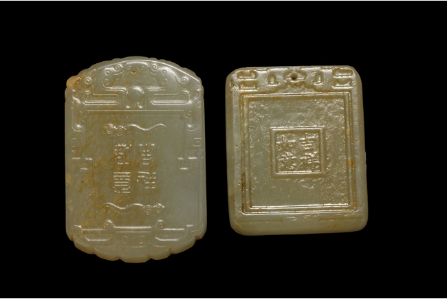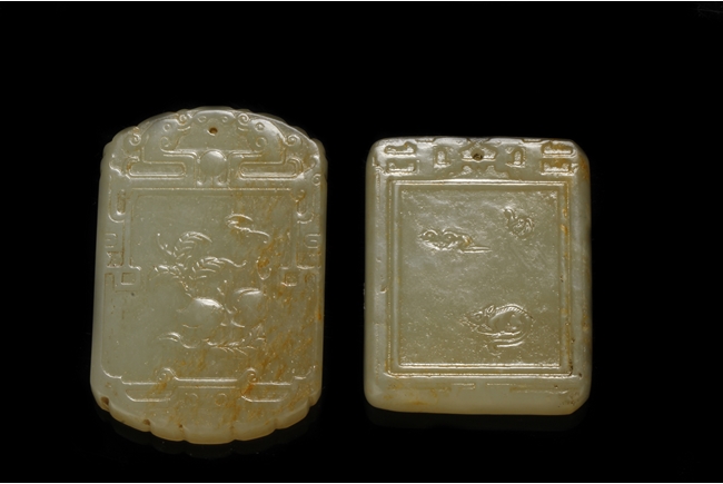 One pendant of oval form, one side carved with peaches and branches, below two dragons and a flaming pearl on the top. The other pendant of rectangular form, one side carved with a mouse under the clouds, the edge surmounted by two phoenix on top. Chinese characters "JI XIANG RU YI" on back of both pendants.