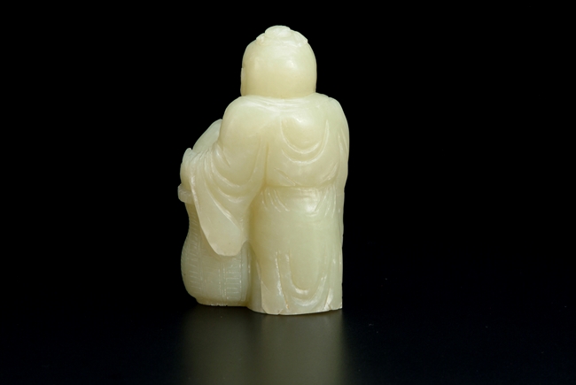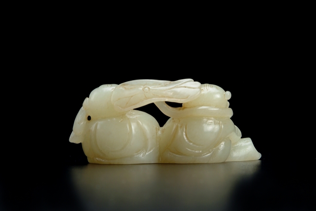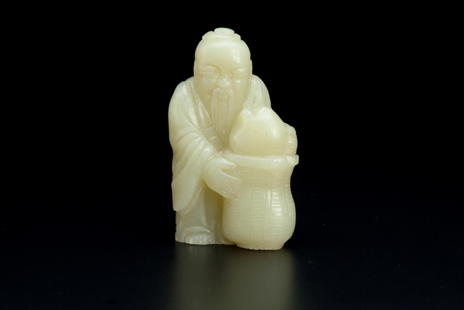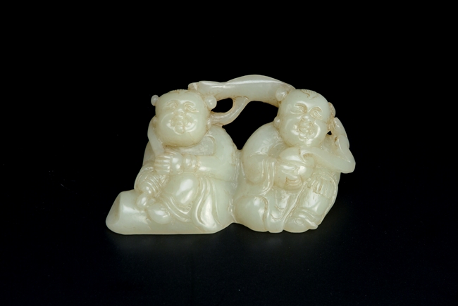 One ornament depicts an elder fisherman holding a basket full of fish, the other ornament depicts two children resting under large lotus leaf.