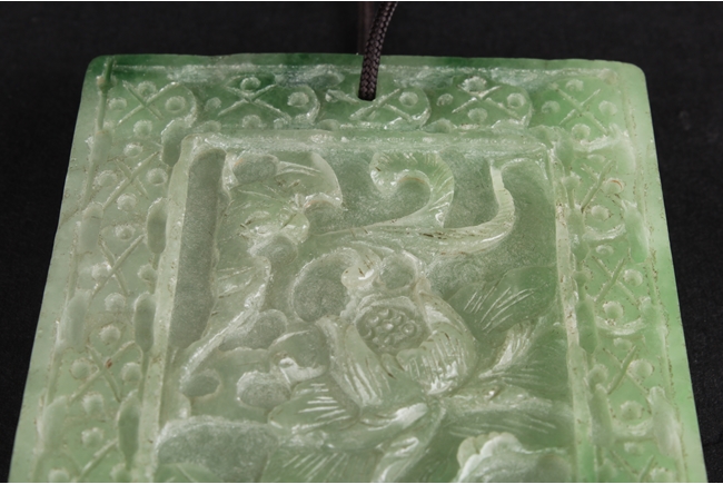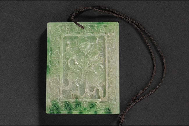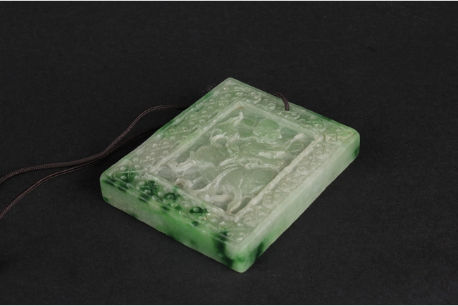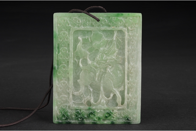 Of rectangular form, the pendant low relief carved a bat flying over a blooming flower on one side, and a rider on an animal on the other side.