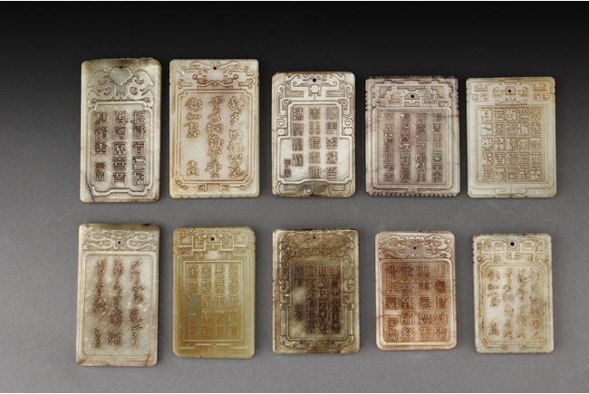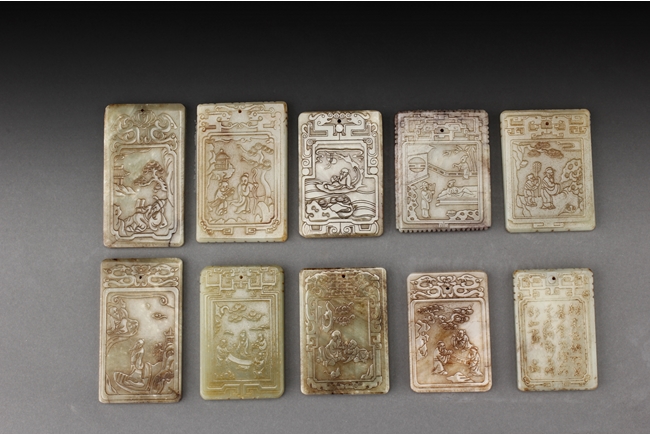 Of rectangular shape, the pendants varies slightly in size and theme, though similar in design. One side of the pendant usually depicts a scene with people engaged in various activities, all with patterned borders, the reverse with a Chinese poem calligraphy within same borders.