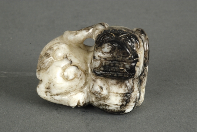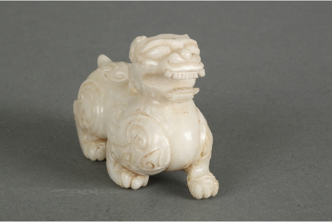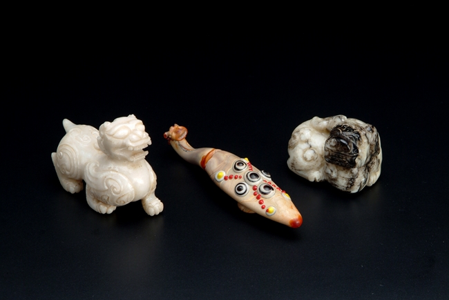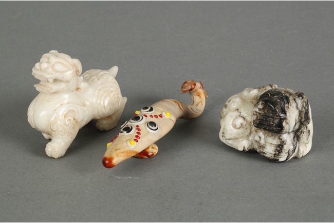 Two Chinese carved jade lion ornaments and a Chinese seahorse ornament