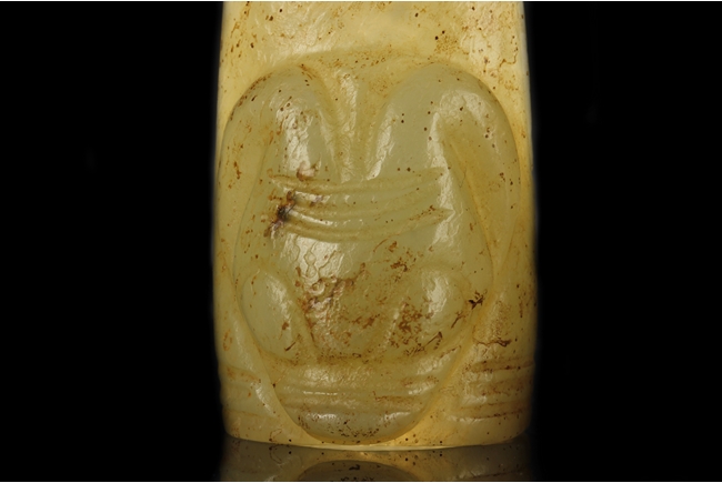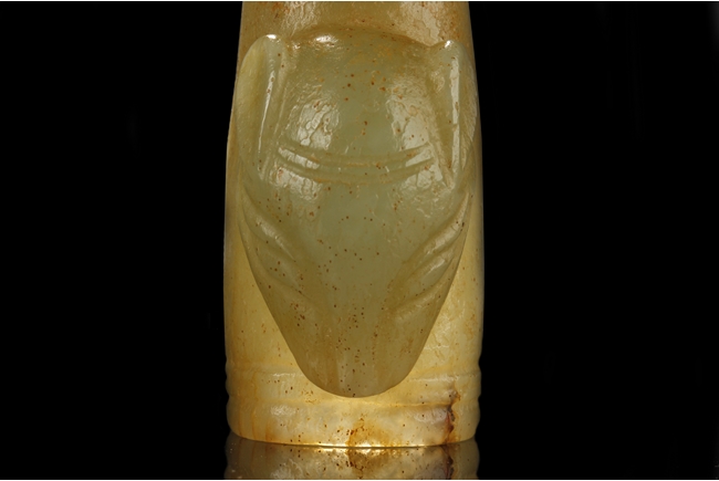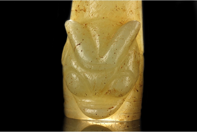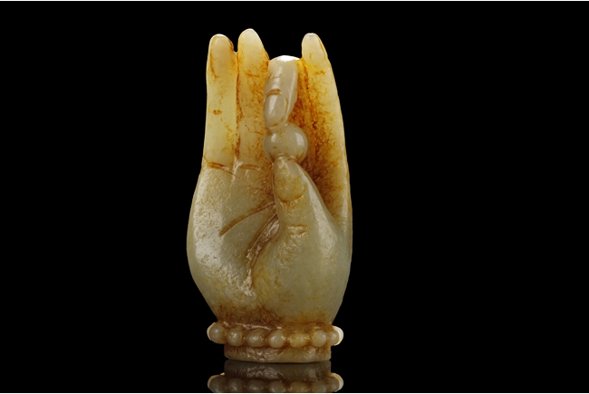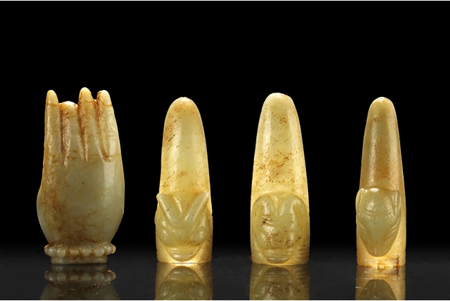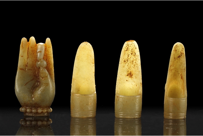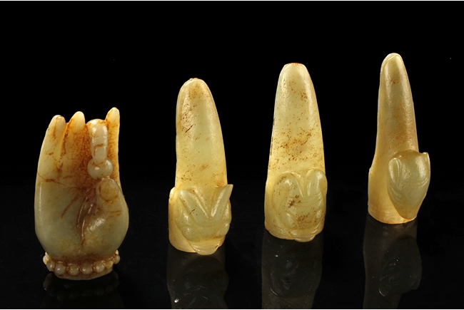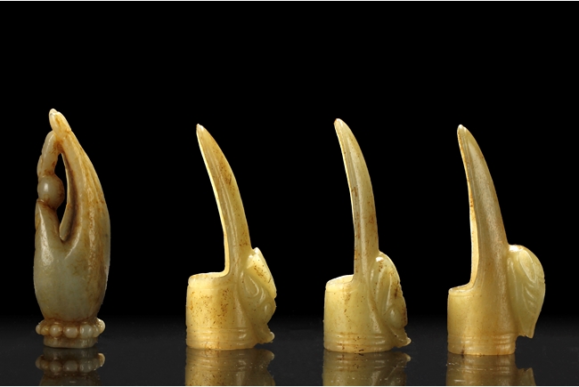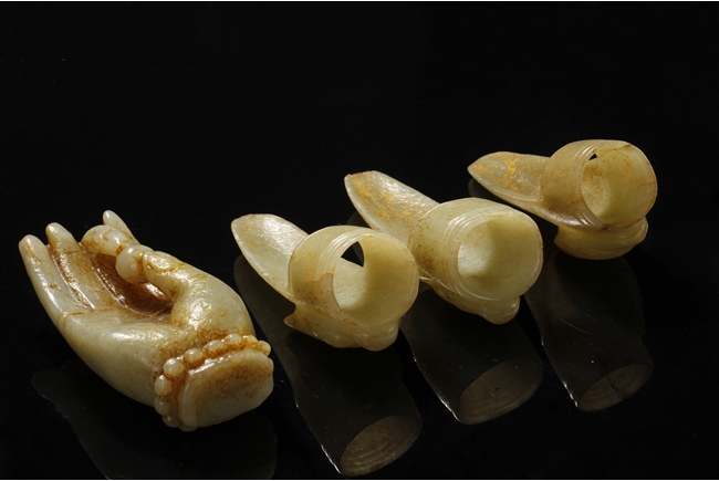 The three jade finger covers all with a different beast head on the outside, a ring fit on the inside, and a curved long cover. The carved jade ornament depicts a Buddha's hand, with two fingers holding a pearl, wrist wearing a beaded bracelet, and hand in mudra. All stones of green-yellow color with occasional russet.