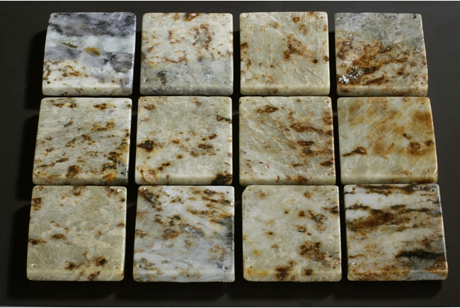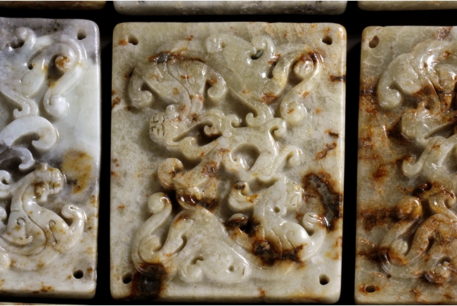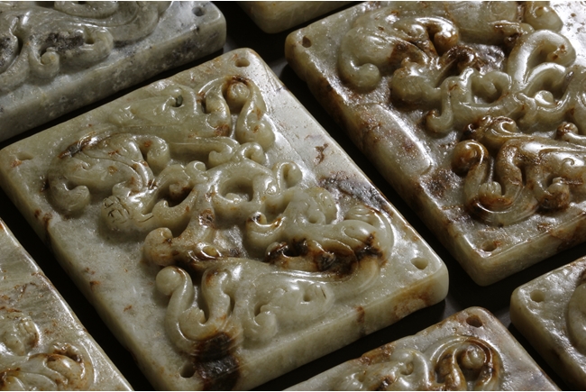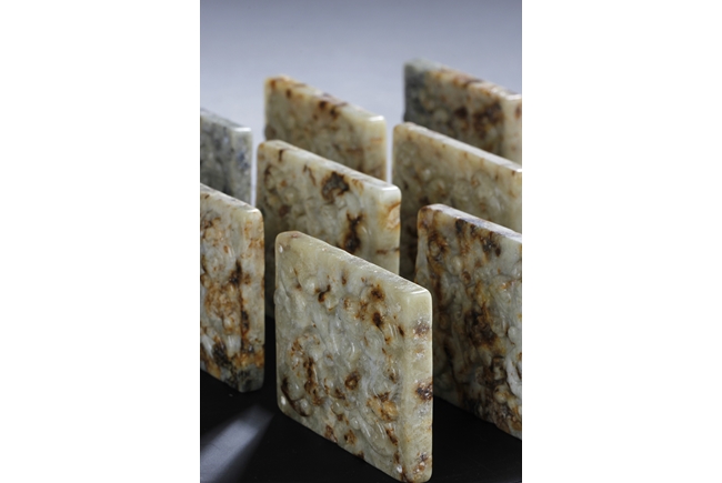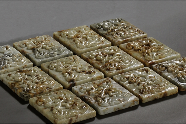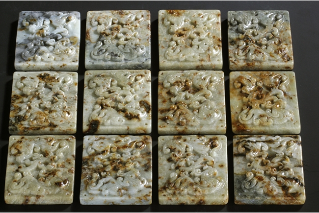 Of rectangular shape, the pendants mostly of celadon and pale color with patches of russet, all depicting mythical beasts on the surface, back side remain uncarved.