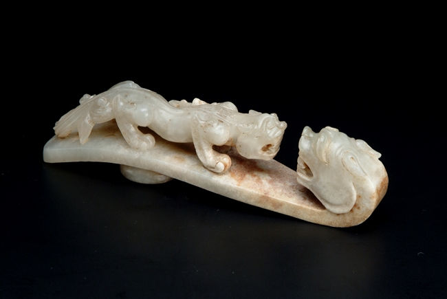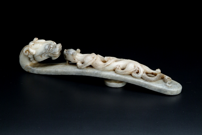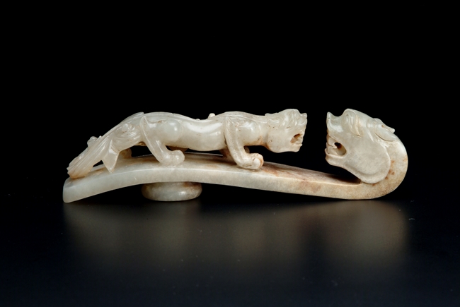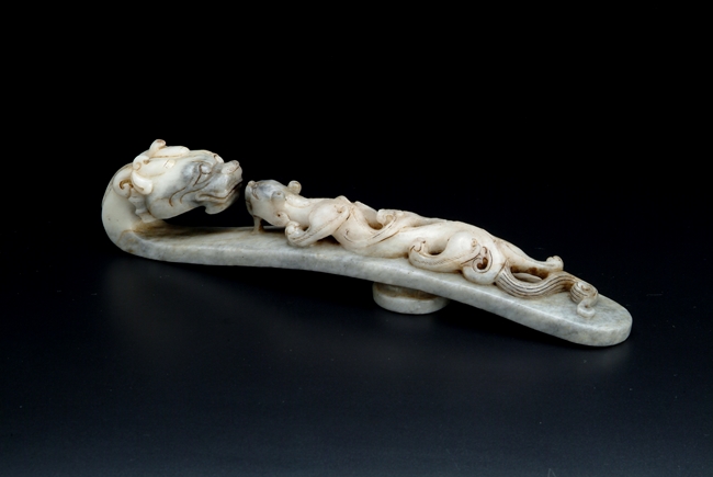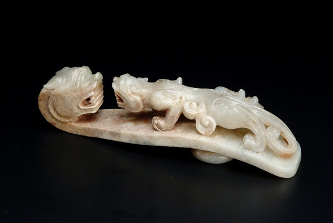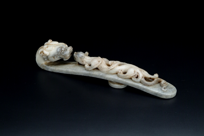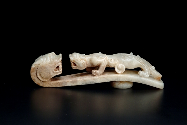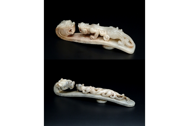 The two jade hooks with similar theme and design, depicting a young Chilong in front of an elder dragon, with a knob on the reverse.