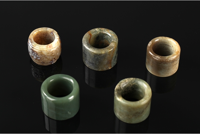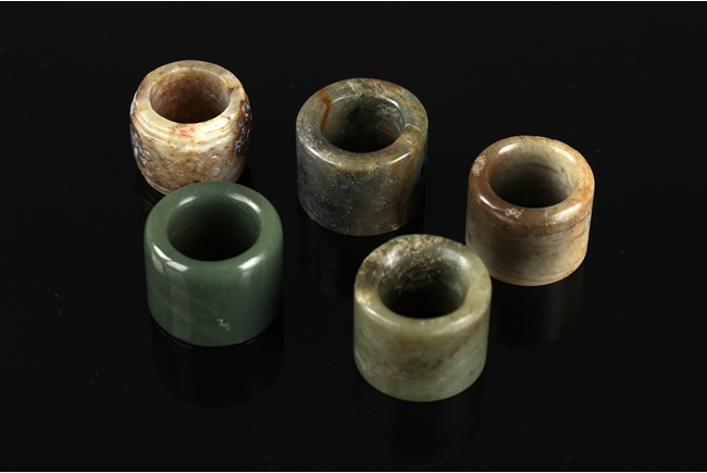 Five (5) Chinese jade thumb rings. Four thumb rings are uncarved, one thumb ring has light patterns.