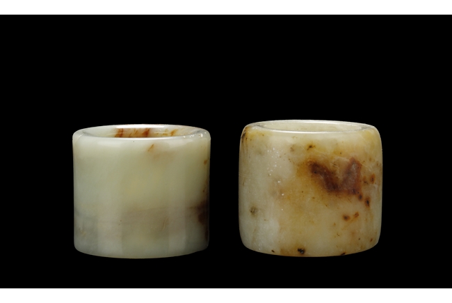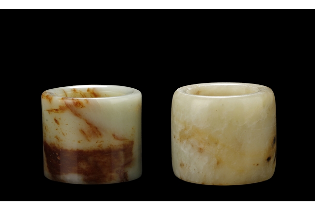 One thumb ring of white and celadon color, with couple russet patches. The top edge concaves inward slightly. The other thumb ring of yellow-white color, with very little russet. The top and bottom edges arches inward slightly.