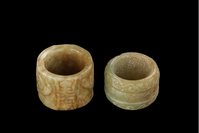 Both rings with green-yellow color, with occasional russet on the surface. One ring slightly larger, carved with bats and Chinese characters. The other ring slightly smaller, carved with Yin-Yang symbol in the middle, between patterned bands.