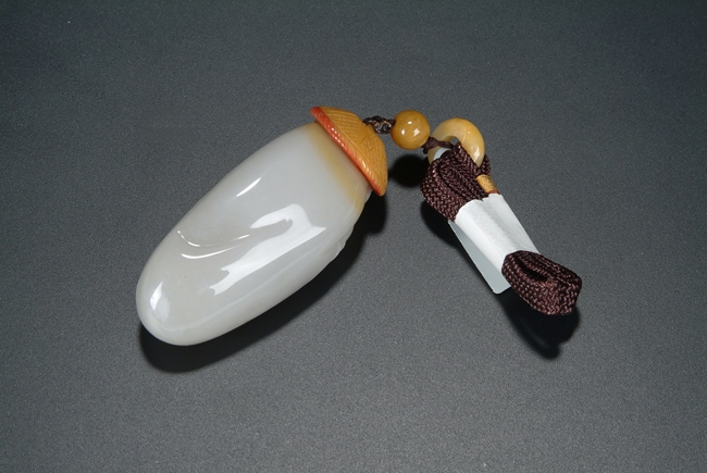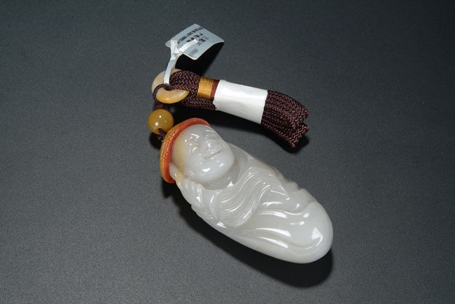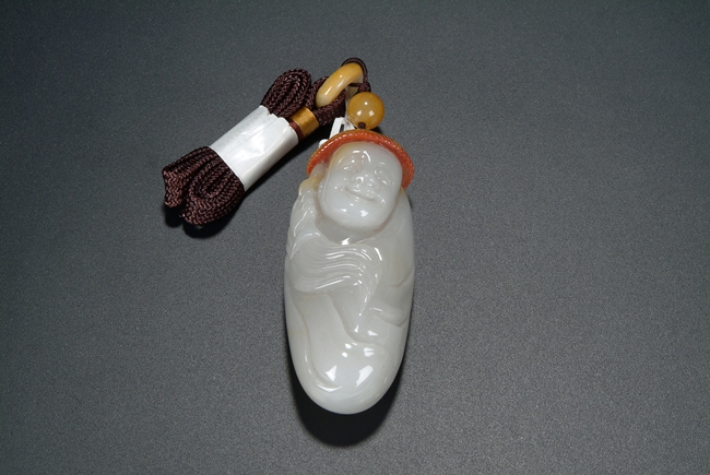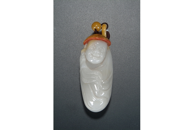 A pendant carved out of a jade river pebble in the form of a human figure. The carver used the natural color of the pebble skin to depict a straw hat on top of the figure. Qing Dynasty period.