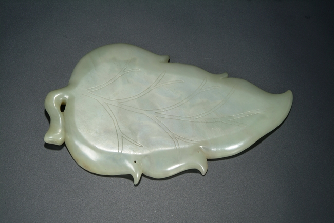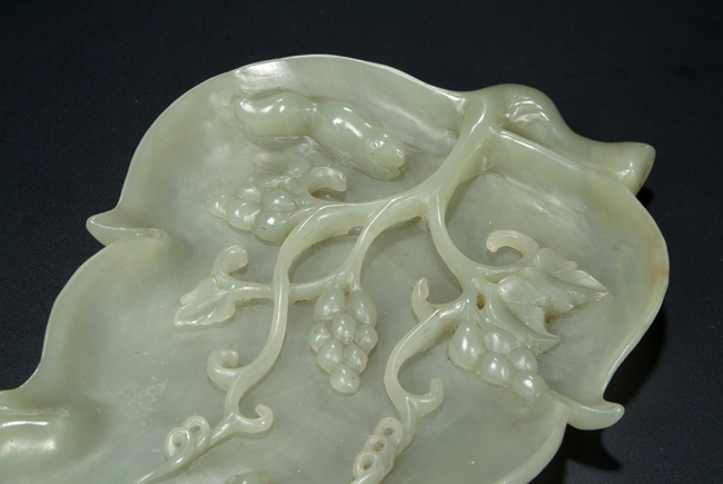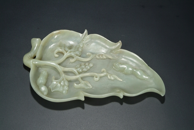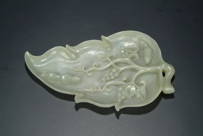 A jade brush washer carved out of Celadon Hetian jade, depicting the scene of two squirrels among the grape vines. Qing Dynasty period.