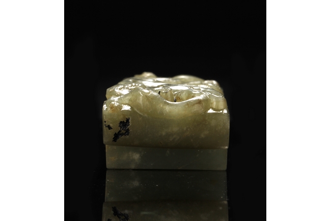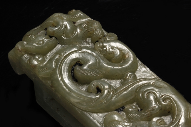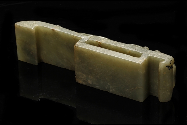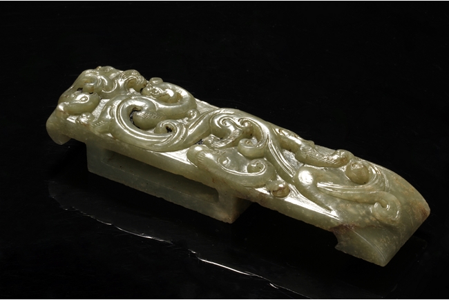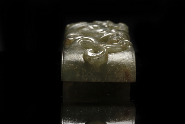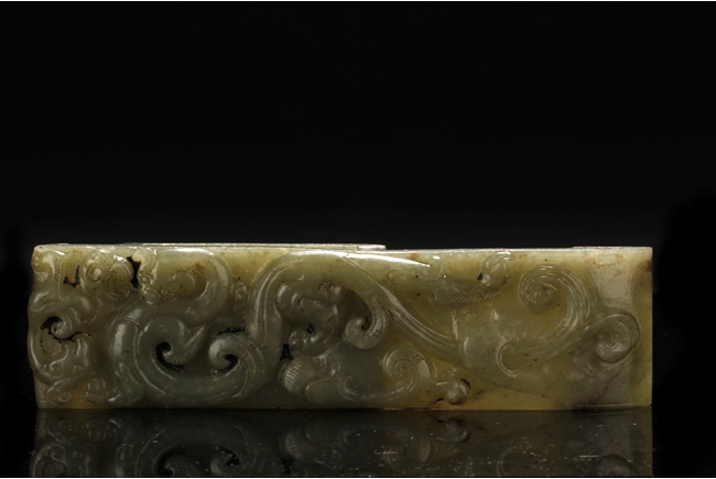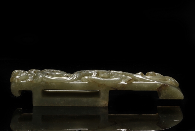 Of long rectangular form, the surface depicts a Chilong amidst clouds, with rectangular fitting on the reverse, stone of celadon color.